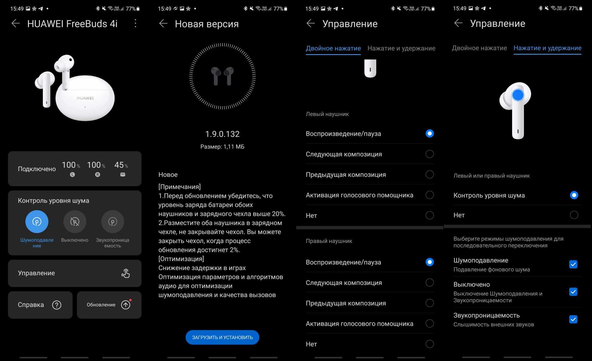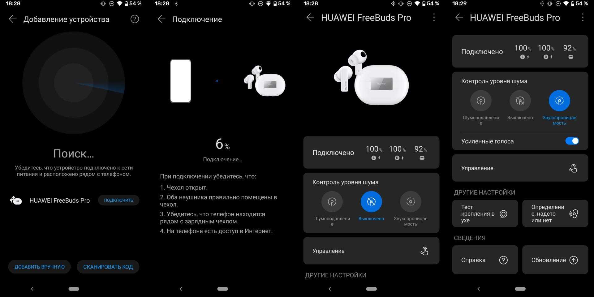 У FreeBuds Pro вы можете выбрать степень шумоподавления. В этом заключается главное отличие от FreeBuds 4i от Pro-версии. По сути, у FreeBuds 4i есть три режима работы шумодава: выключен, включён и режим «прозрачности», когда вы слышите окружающие шумы и голоса, не снимая наушников. А вот степень давления шума у наушников настроить нельзя.