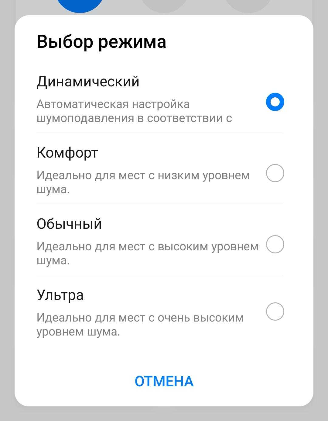 Huawei заявляет, что активный шумодав снизит количество внешних шумов до 40 дБ. Шумодав работает в двух режимах: активный и прозрачность. При этом вы можете настроить поглощение звука в три степени: комфорт, обычный и ультра. Они зависят от уровня громкости окружающих шумов. Не хотите постоянно залезать в приложение и менять эти настройки? Тогда ваш выбор — «Динамический» режим работы шумодава, который автоматически подстраивается под окружающую среду.