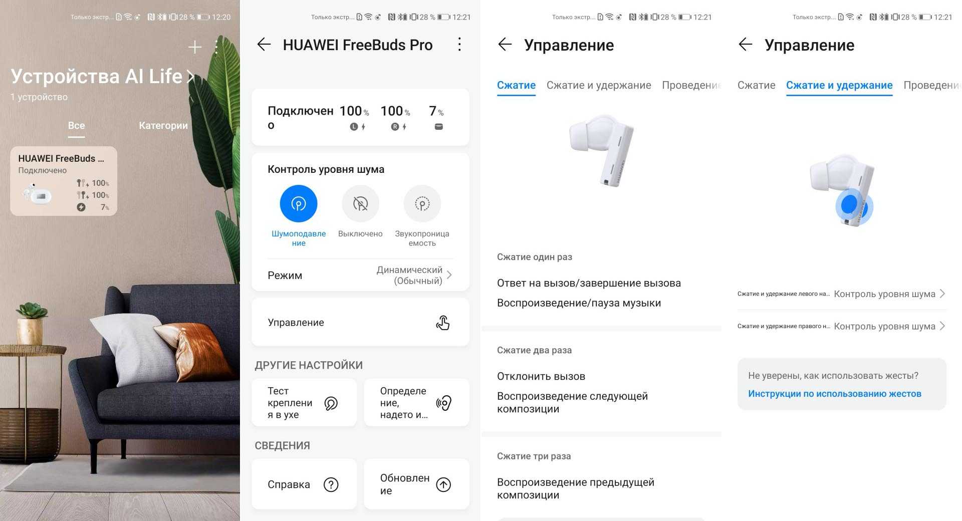 Традиционно наушники Huawei имеют более детальные настройки при сопряжении со смартфонами своего же бренда, а все остальные используют приложение Ai Life (Play Маркет, ). В нём можно переназначить функции нажатий, выбрать опции шумоподавления и обновить прошивку наушников. Из необычного – тест крепления в ухе: хитрые технологии включают музыку и определяют правильно ли она звучит.
