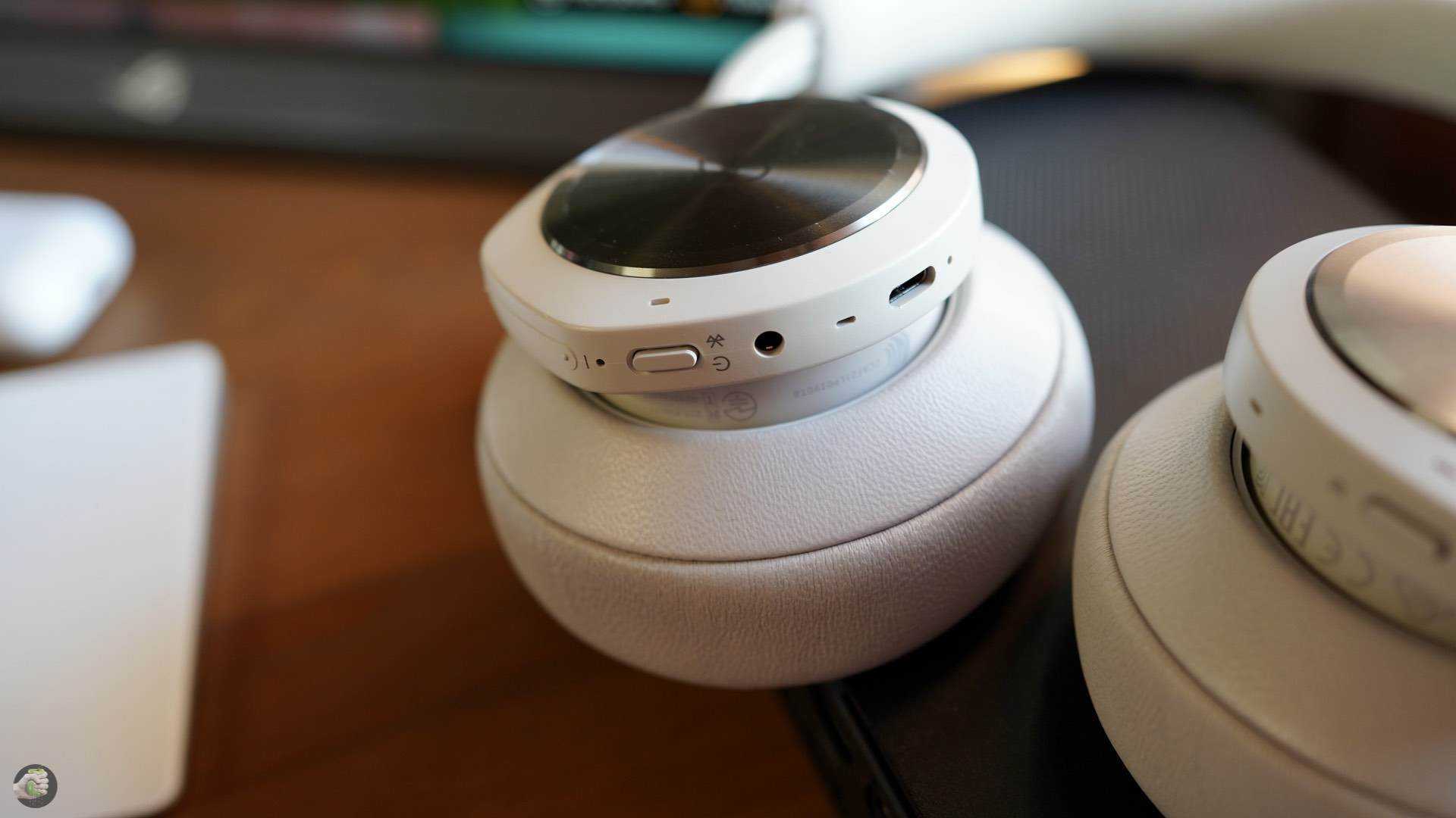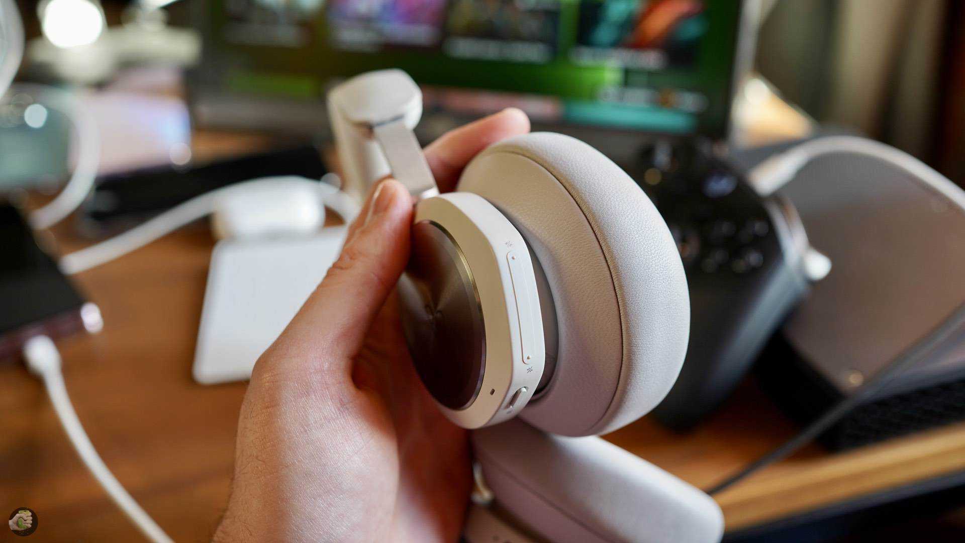 Here, the manufacturer must be given top marks because, as is typical for B&O, gamers can now join those who can put premium quality headphones on their heads. Our test sample came in black and anthracite (light grey and blue are also available), with a headband covered in lambskin, with breathable, knitted bamboo fibre padding and a notch in the middle to relieve pressure on the head. The aluminium rails, which extend as smoothly as butter, are embedded in the headband, and from that hangs the ear cups, which have all the controls and the soft ear pads made of lambskin. The two aluminium discs with the manufacturer’s logo on the outside of the ear cups not only have a very discreet anodised finish that reflects different colours depending on the amount of light, but also have touch functionality and respond to commands by being tapped.
