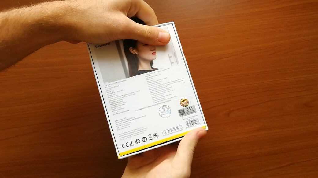 На оборотной стороне изображена симпатичная китаянка с Baseus Encok W09 в ушах. Но нам более полезно то, что здесь подробно указаны технические характеристики, причем не только на родном для этой девушки, но и на английском языке.