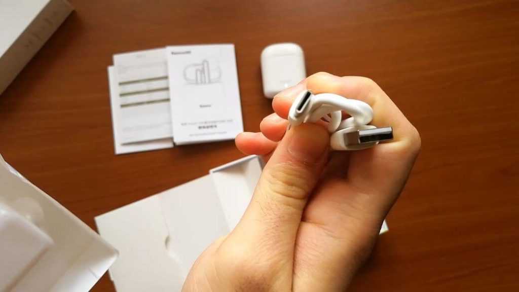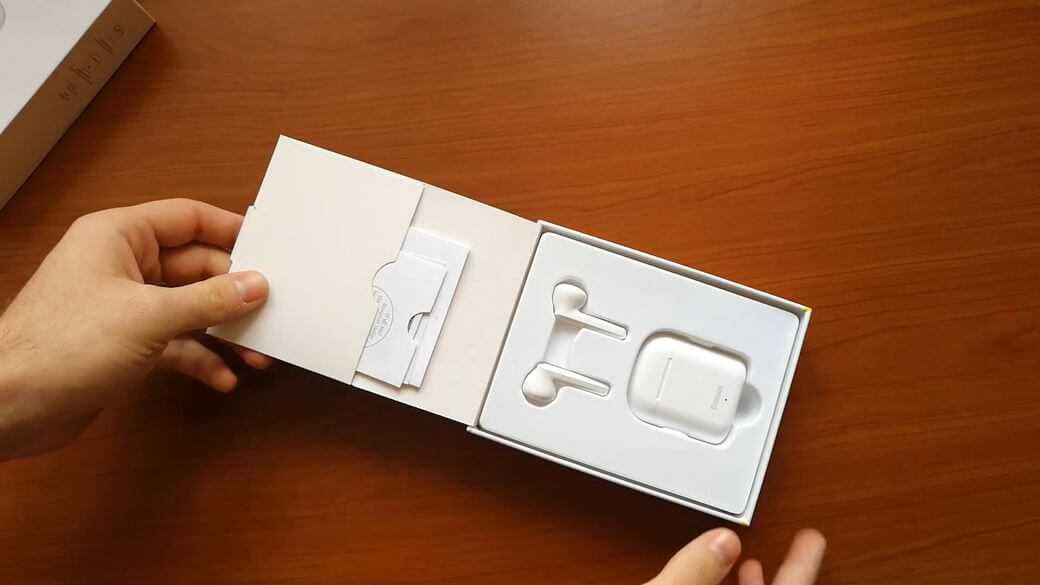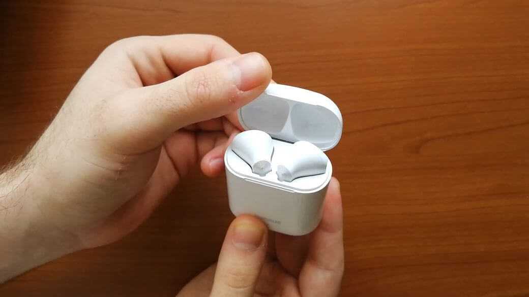 Открываем упаковку и обнаруживаем беспроводные наушники, размещенные отдельно от чехла. Для презентации — выглядит отлично. Но на практике сразу подключить их и пользовать не получится, так как модули за время транспортировки и ожидания на почте разрядились.