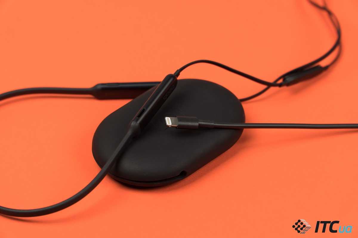 Пульт управления находится на кабеле под левым ухом. С помощью него можно регулировать громкость, отвечать на звонки и переключать треки. На гарнитуре размещены два блока с обеих сторон. Кнопка сопряжения с Bluetooth устройствами находится под правым наушником. Она бесшумная и включение можно заметить только по светодиоду. Левый блок скрывает встроенный аккумулятор, на нем расположены гнездо зарядки Lightning и микрофон.