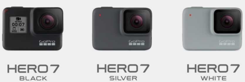 GoPro Hero 7 White – самая доступная новинка из трёх, с возможностью записи видео с разрешением 1080р при 60 кадрах в секунду. Аккумулятор не съёмный, на передней панели нет экранчика. Стабилизации видео тоже нет. Начальный вариант для неприхотливых пользователей.