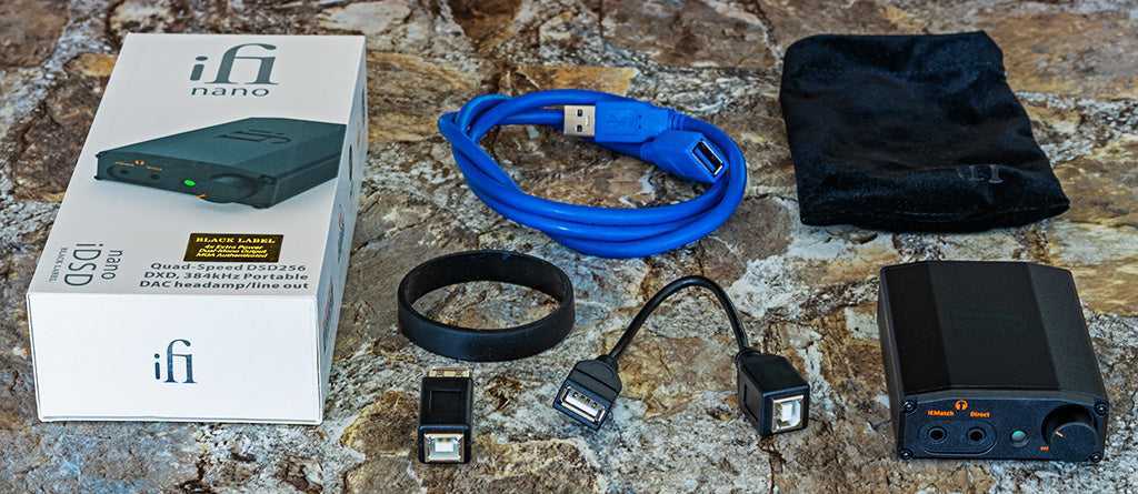 As is typical with iFi products, the package includes all of the items you are likely to need to make the unit work. In this case that includes a 1m (3 foot) USB-A to USB-A OTG cable, for direct connection to a computer or other standard USB source. In addition there are two adapters that allow you to use an existing USB-A to USB-B cable (the most common type of USB cable for DACs, sometimes referred to as a “USB Printer Cable”) one a simple, short, inline adapter, and the other as a more flexible 6” long adapter with a flexible cable in the middle.