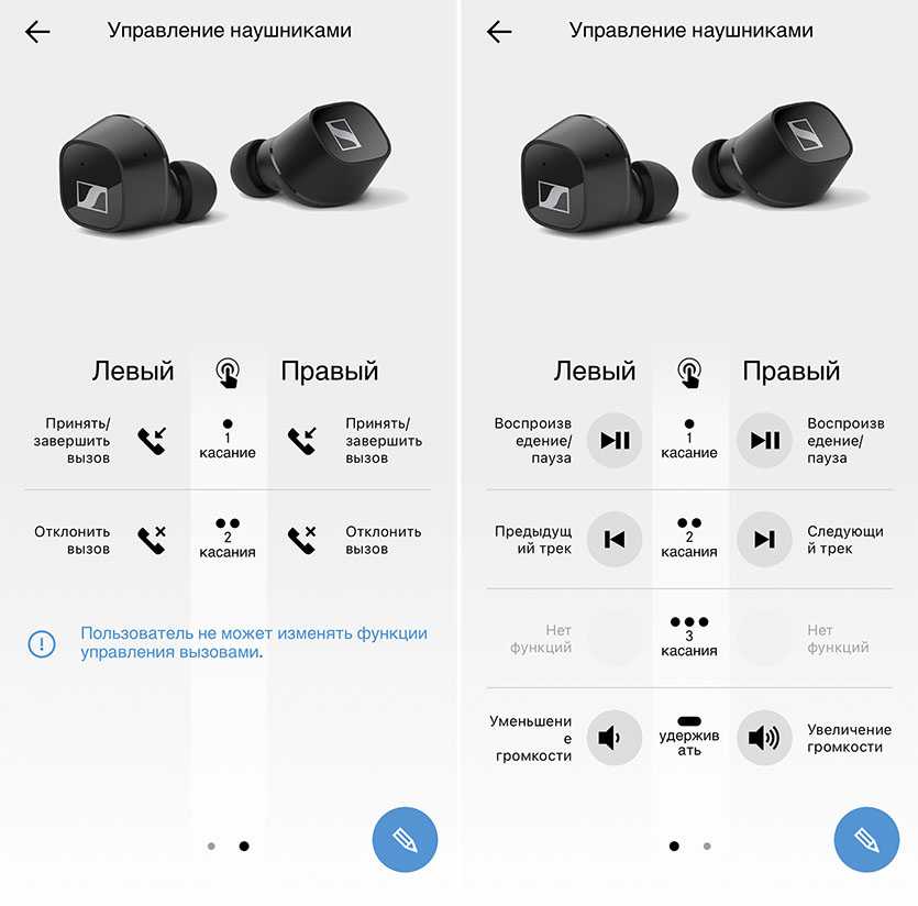 Также в приложении можно настроить сенсорное управление наушников, назначив разные действия на один, два или три тапа по правому или левому наушнику.