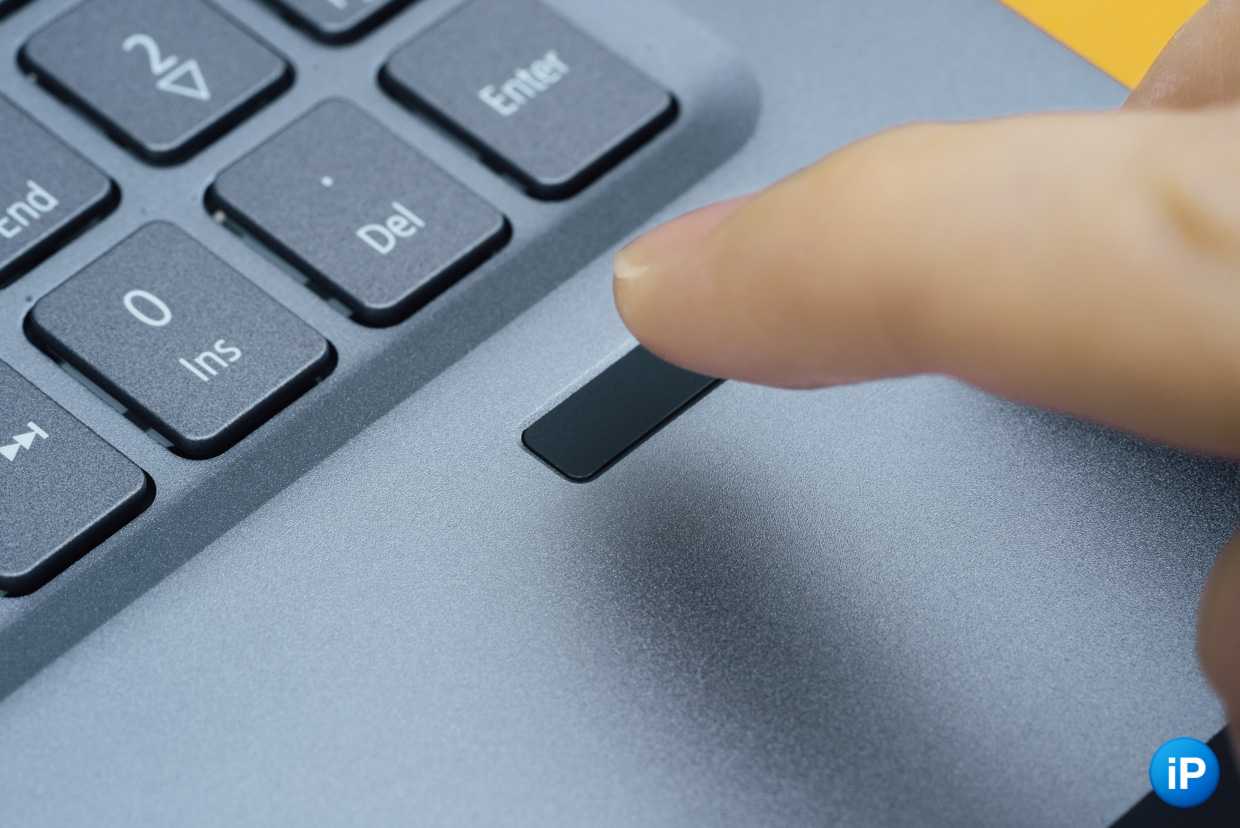 В правой стороне под блоком клавиш находится сканер отпечатка пальца, он простого вида, ни в какую кнопку не интегрирован.
