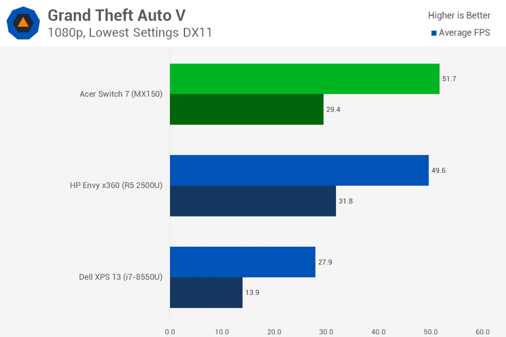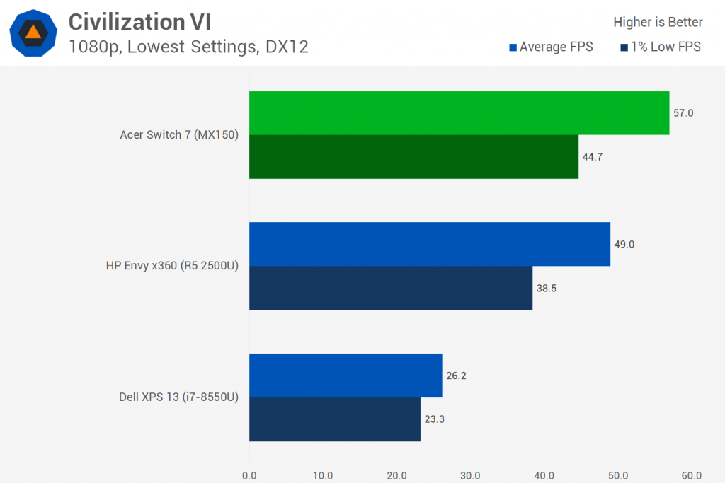 Что касается игр, MX150 не является мощным графическим процессором, поэтому вы не должны ожидать воспроизведения всего на этом планшете. Однако, поскольку это намного быстрее, чем встроенная графика, вы можете получить достойный опыт. Например, с помощью Grand Theft Auto V вы можете получить 50 FPS при 1080p и выше 30 FPS в собственном разрешении дисплея, используя самые низкие параметры настройки. Civilization VI очень хорошо воспроизводится в самых низких настройках родных res, что является хорошей новостью.