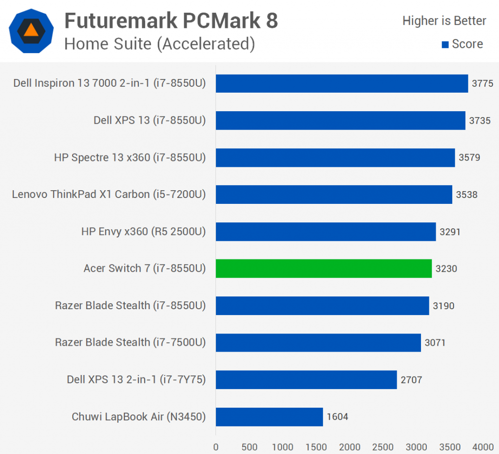 В тесте Basemark, серьёзно нагружающем систему, Switch 3 разрядился через 2,5 часа. Для сравнения, Asus Chromebook Flip, Samsung Galaxy Book и Microsoft Surface Pro продержались дольше 5 часов.