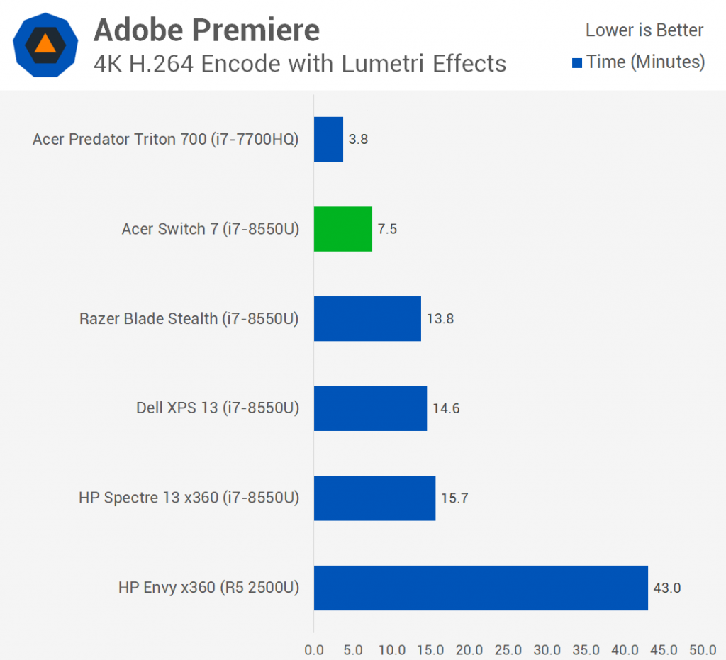 Конечно, основным преимуществом MX150 является то, что он намного быстрее, чем встроенная графика Intel. В самых тяжелых нагрузках GPU MX150 примерно в 2,3 раза быстрее, чем UHD 620, встроенный в i7-8550U. Это дает ему большое преимущество в приложениях, которые используют GPU: Premiere, например, отображает видео 4K с эффектами Lumetri на 84 процента быстрее с MX150 внутри, чем с i7-8550U.
