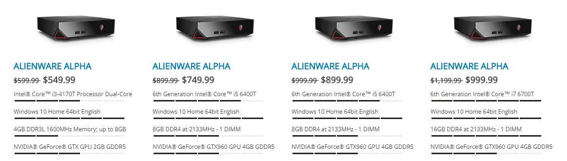 Устройство называется Alpha, оно доступно в трёх основных конфигурациях, каждую из которых можно немного видоизменить в онлайн-конфигураторе. Аппараты могут использовать процессор Core i3-4130T или Core i5-4590T, иметь от 4 до 8 гигабайт оперативной памяти, 500ГБ или же 1ТБ винчестер, нечто с 2ГБ памяти от Nvidia на базе архитектуры Maxwell в качестве графического адаптера.