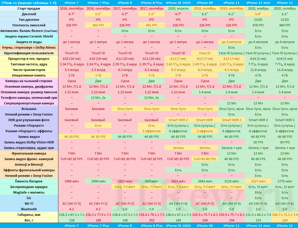 Отличия характеристик актуальных версий iPhone. Кликните для увеличения