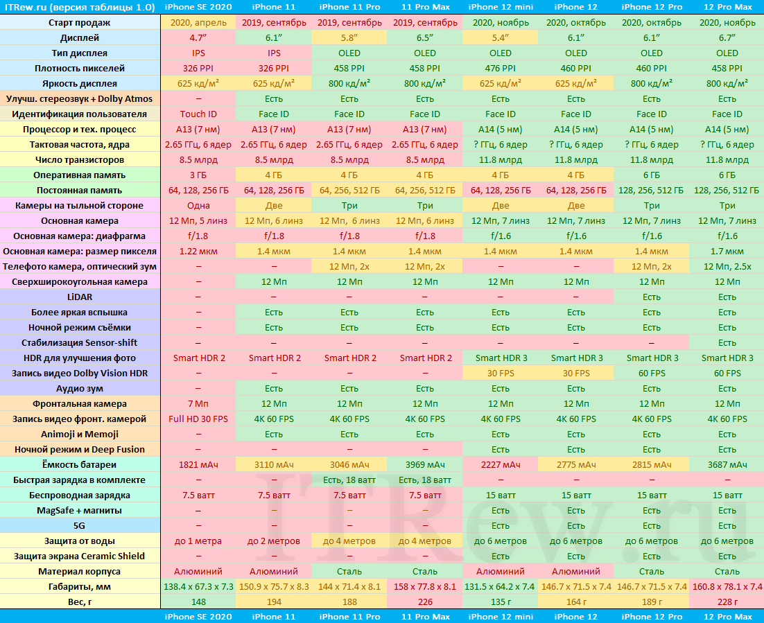 Поэтому для наглядности мы предлагаем вам опереться на две наших таблицы. В первой из них представлено сравнение наиболее актуальных версий iPhone: линейки 12, 11 и вышедшего весной SE: