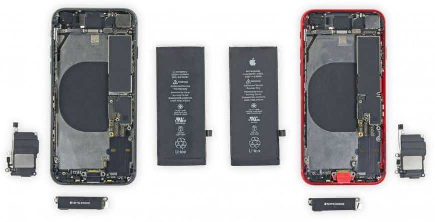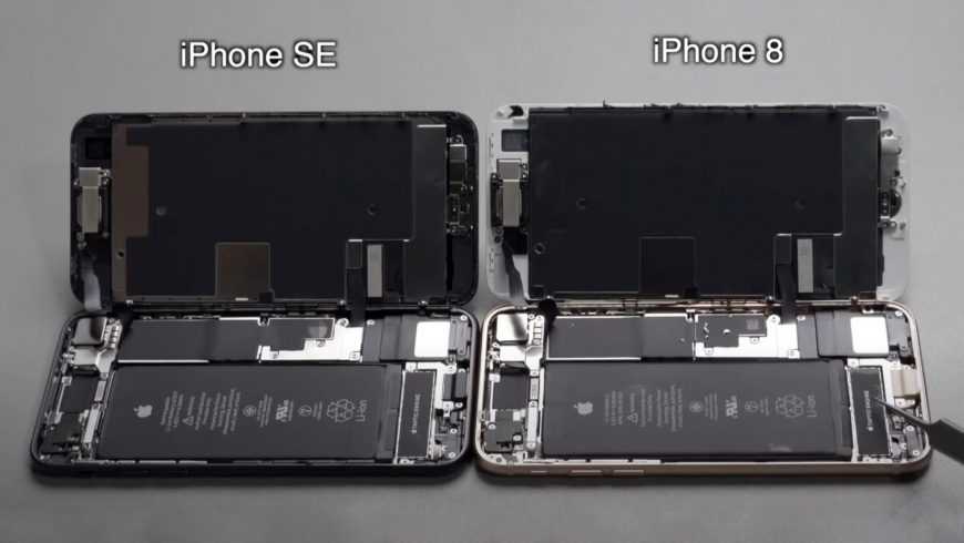 Фото: iFixIt. Слева iPhone 8. Справа — SE второго поколения.