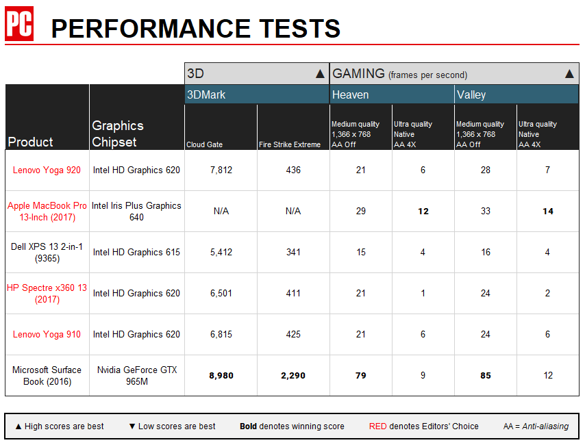 Однако, как и большинство конвертируемых 2-в-1 с интегрированной графикой, Yoga 920 не является отличным выбором для игр или приложений с интенсивной графикой. Он не смог преодолеть порог 30 кадров в секунду в наших игровых тестах Heaven и Valley, даже при настройках среднего качества. Никто из конкурентов не справился с этой задачей намного лучше, за исключением Microsoft Surface Book, в которой установлена графическая карта Nvidia, и MacBook Pro, в которой установлен превосходный интегрированный графический процессор Iris Plus.