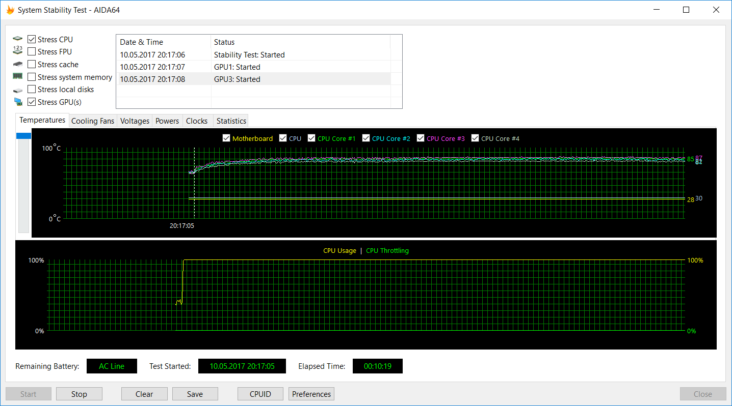 Система охлаждения ноутбука со своей задачей справляется отлично. В режиме простоя или при лёгкой нагрузке, вроде воспроизведения Full HD видео, система охлаждения будет работать практически бесшумно, турбины ноутбука начнут разгоняться только при появлении серьёзной нагрузки, вроде игр. При этом, громко шуметь ноутбук не станет. В стресс-тесте, при одновременной максимальной нагрузке на процессор и дискретную видеокарту СО также отлично справилась со своей задачей. При 10-минутном тестировании в AIDA 64 максимальная температура процессора составила 88 градусов, а сам CPU ни разу не уходил в троттлинг. Это отличные результаты, учитывая, что для процессора и видеокарты используются одни и те же тепловые трубки.