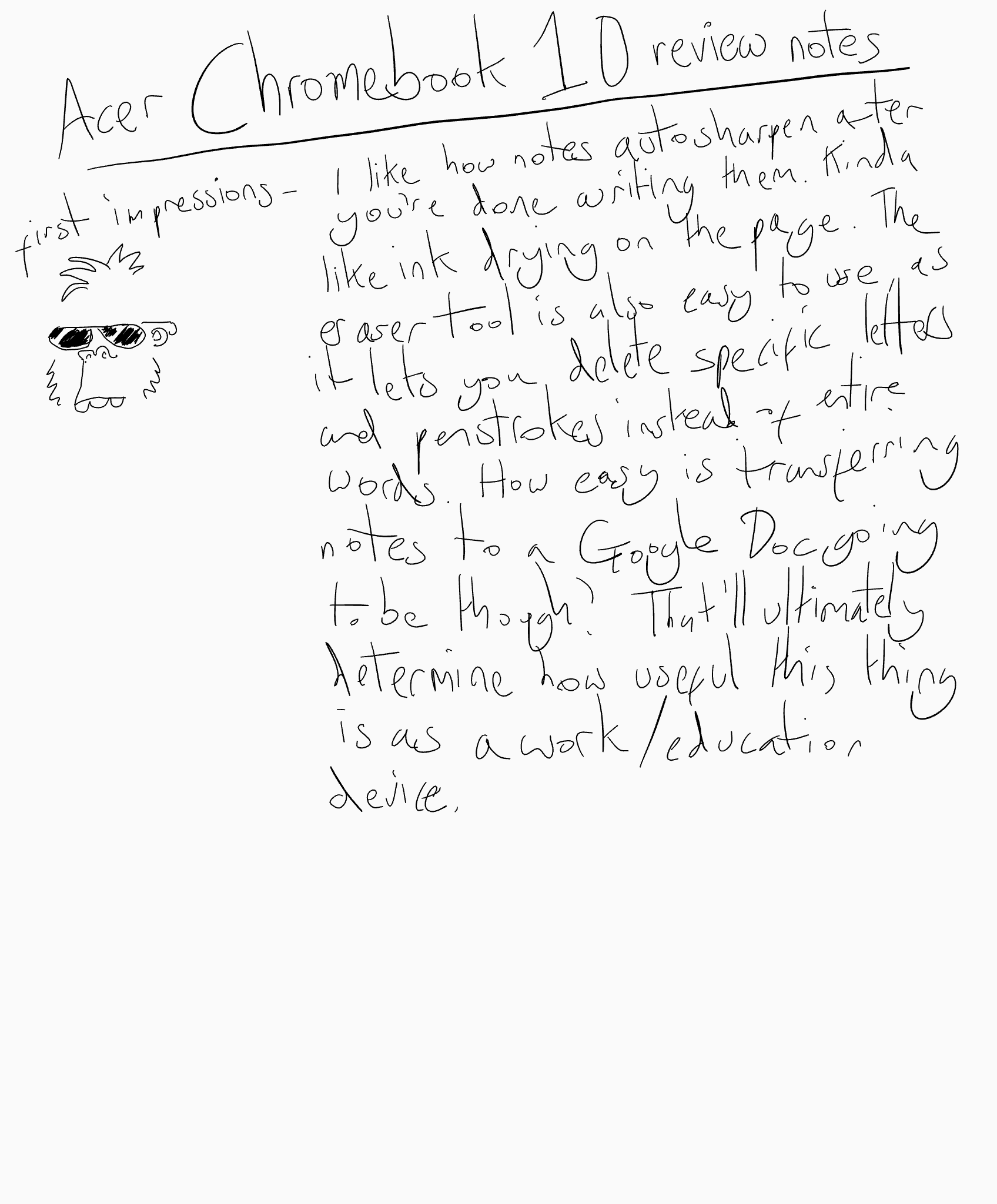 Обидно, потому что, если вы возьмете это с собой в поездку или на лекцию, я смогу вынуть стилус, быстро набросать что-нибудь в Документах, синхронизировать его с Google Диском и с этим покончить.