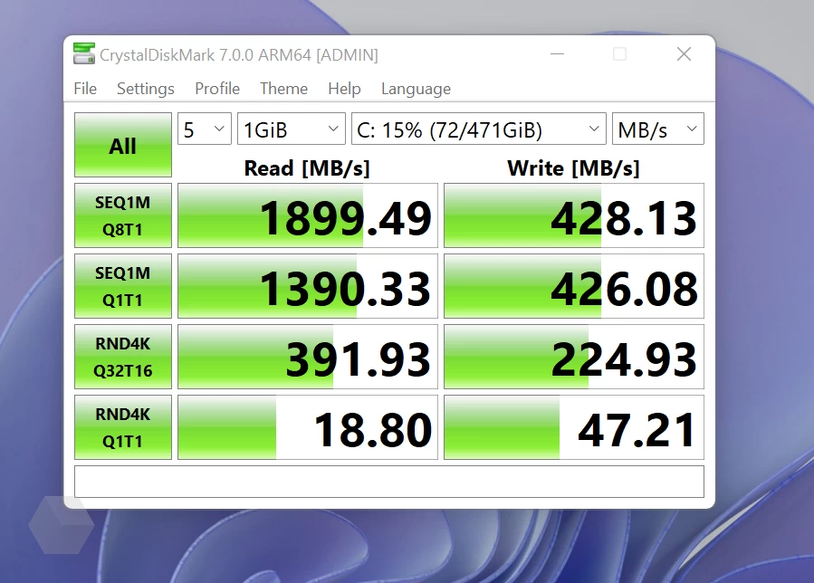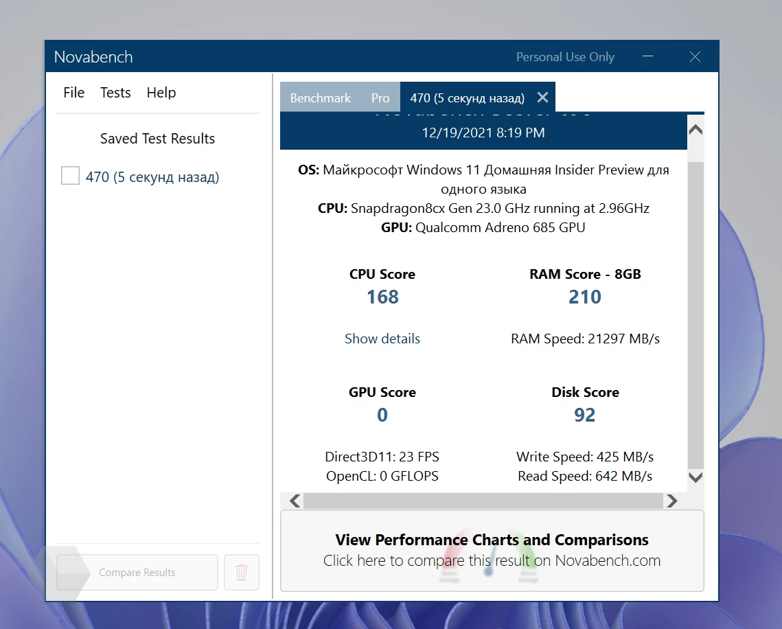 Синтетические тесты показали, что процессор в Acer Spin 7 уверенно держится на уровне, например, чипов Intel Core i5 10 поколения. Скорость обмена данными штатного накопителя не самая высокая, но показатели не настолько медленные, чтобы делать выводы о его несостоятельности. Работать с файлами можно без всякого диссонанса, а вот приложения устанавливаются с заметной задержкой. После установки и запуска приложения с быстродействием порядок, так и не скажешь, что здесь не самый новый Qualcomm.