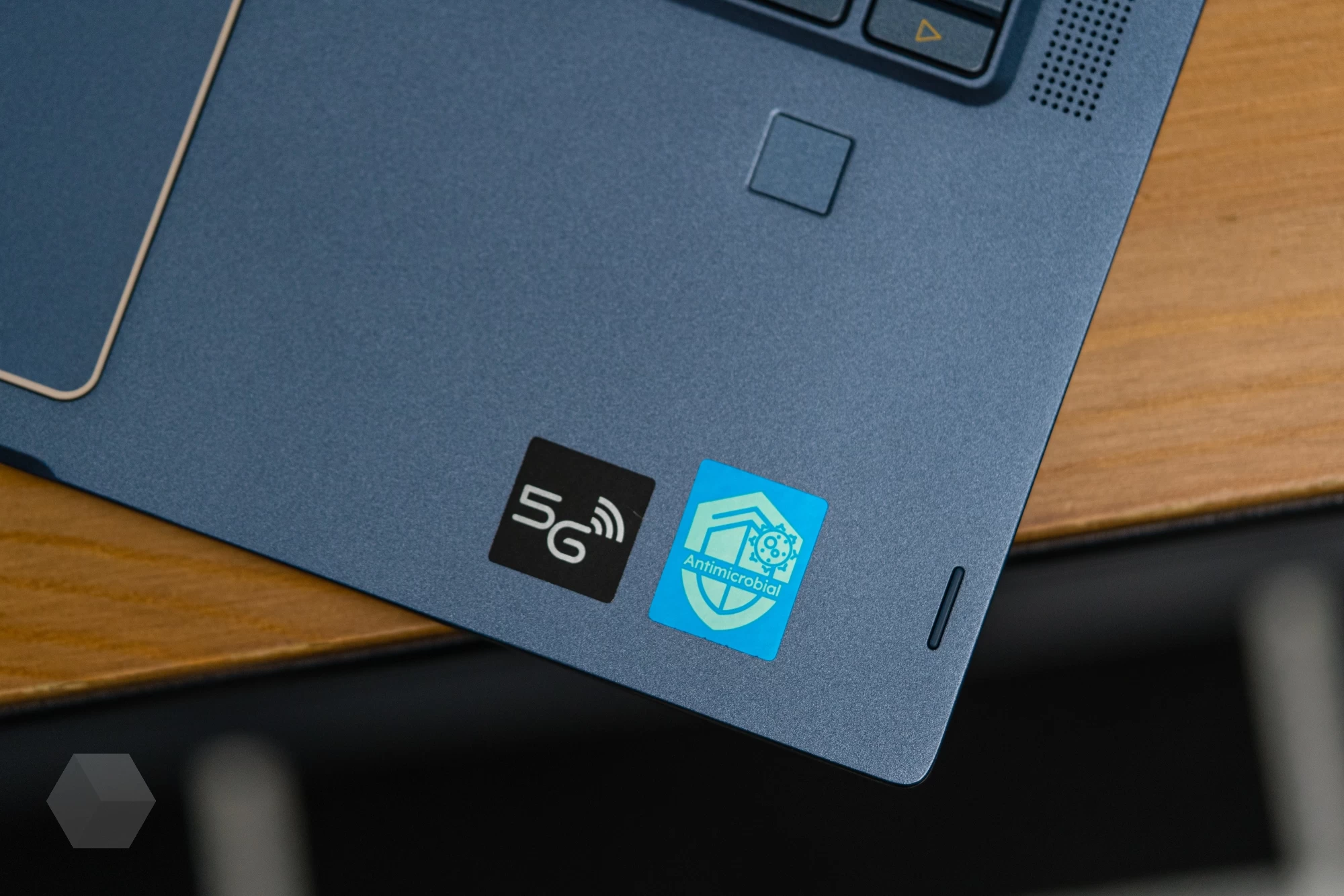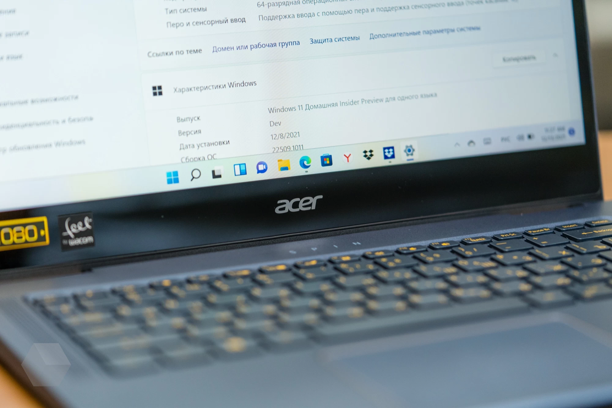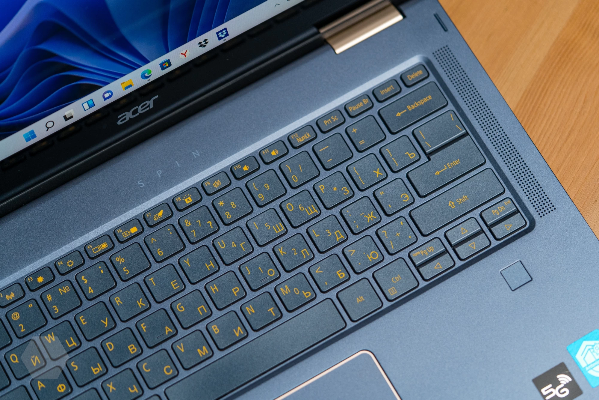 На основной панели и нижней рамке дисплея не обошлось без наклеек. Производитель выделяет наличие поддержки стилуса и 5G, указывает на разрешение FHD, а также подчёркивает антимикробное покрытие стекла дисплея, клавиатуры и сенсорной панели. Злободневная тематика проникла и сюда, но решение только в плюс, разве что не каждый пользователь сможет проверить это в работе. Отмечаем логотипы Acer под экраном и Spin над клавиатурой, четыре силиконовые вставки по углам корпуса для того, чтобы дисплей не соприкасался с клавишами, и осматриваем органы управления устройством.
