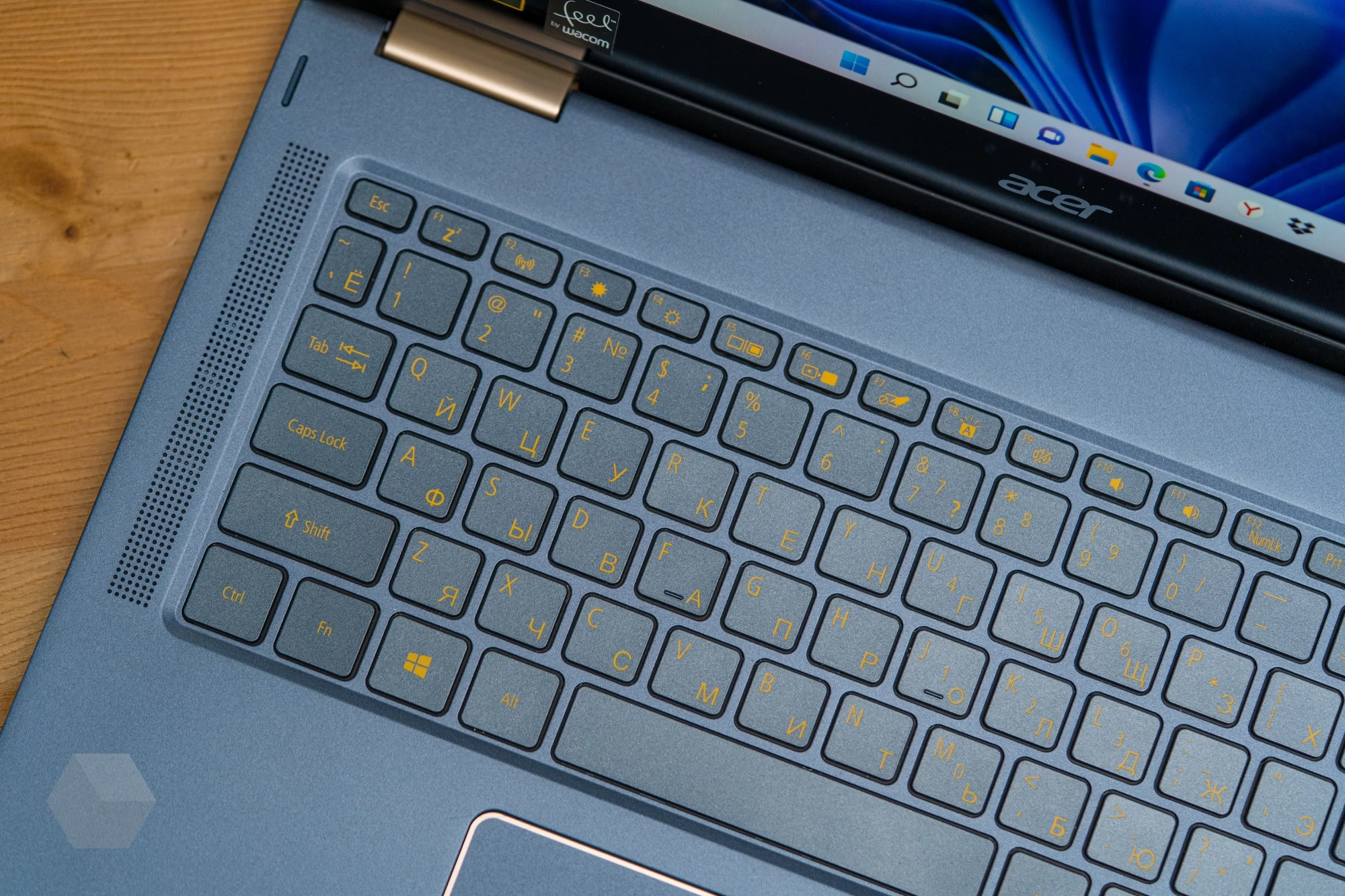 Клавиатура Acer Spin 7 слегка утоплена в корпус, имеет подсветку с одним уровнем яркости. На клавишах нанесена гравировка приглушенного желтого цвета, в сочетании с подсветкой смотрится эффектно. Буквенные переключатели полноразмерные, ряд клавиш F ощутимо более узкий, как и «стрелочки», и клавиши Pg Up и Pg Dn. По всей видимости, увеличить размер последних двух помешала компоновка динамиков: они расположены по бокам от клавиатуры.