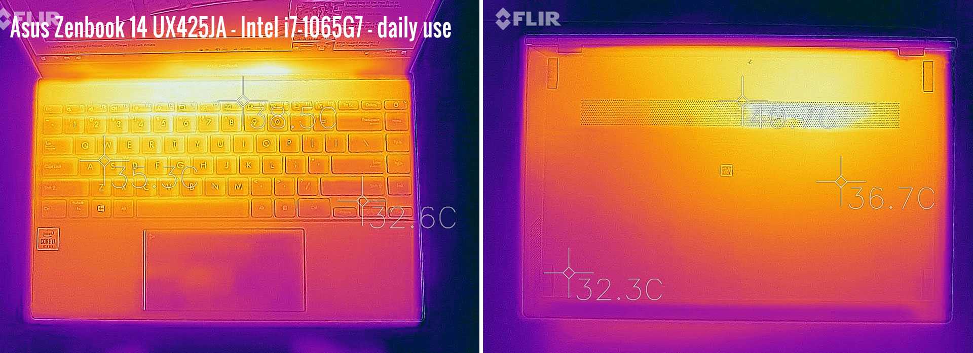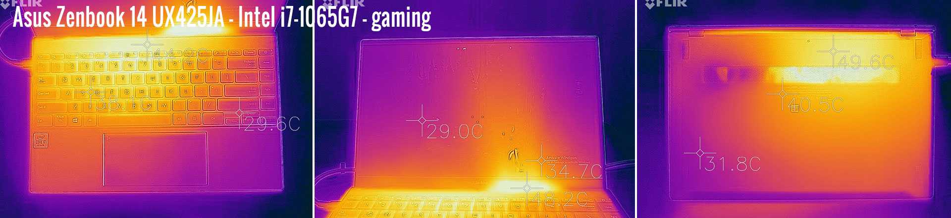 As it is, our Zephyrus UX425 samples ran warm with daily use (but remember that’s with mostly passive cooling), and averagely hot with taxing loads. We measured temperatures in the mid-40s on the keyboard deck and high-40s on the bottom, but also high-40s on the screen’s chin, right next to the exhaust. However, as explained in a previous section, that thicker chin takes most of the exhausting heat and the actual panel doesn’t run as hot as on the ZenBook UX434.