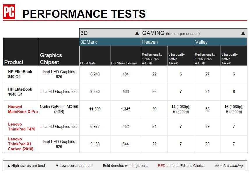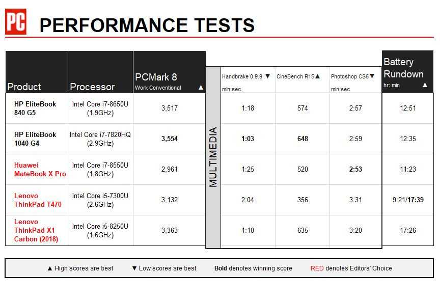 В общем тесте производительности Geekbench 4 EliteBook 840 получил отличные 13 253 балла. Он превысил средний показатель среди ноутбуков премиум-класса 10 483, Matebook X — 12913 (Intel Core i7-8550U) и ThinkPad X1 — 13 173 (Intel Core i5-8250U). Latitude 7490 смог обойти всех конкурентов с результатом 14 458 баллов (Intel Core i7-8650U).