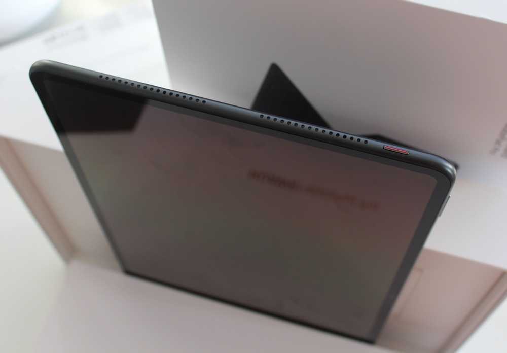 Благодаря узким (4,2 мм) экранным рамкам полезная площадь дисплея больше (92%), а корпус компактнее. По бокам планшета расположены четыре динамика. По два слева и справа. На торцах также находятся кнопка питания, качелька регулировки громкости и порт USB Type-C.