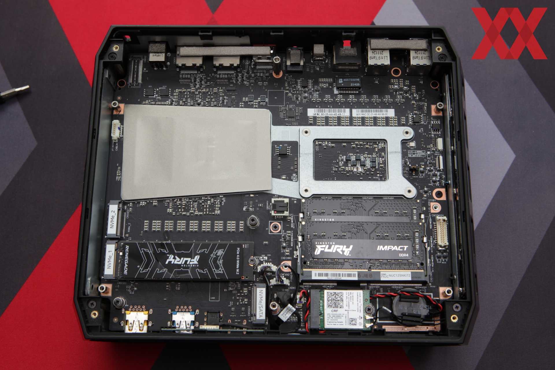 NUC 12 Serpent Canyon можно приобрести как barebone, после чего установить оперативную память и M.2. Либо взять в комплекте с упомянутыми компонентами. Чтобы установить SSD и память, корпус необходимо открыть, что мы и сделали.