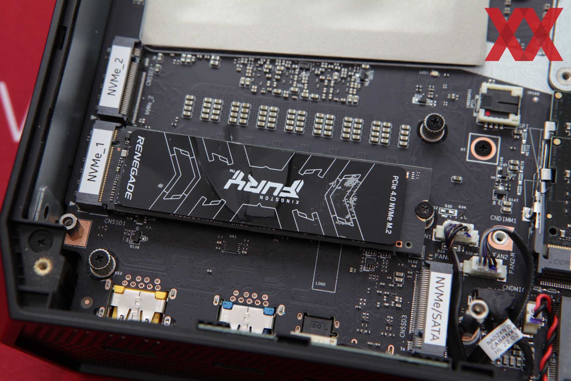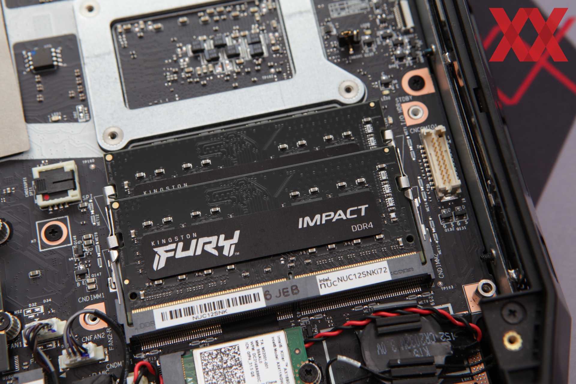 Наш тестовый образец был хорошо оснащен. Внутрь были установлены 2x SO-DIMM DDR4-3200 от Kingston с таймингами 20-22-22-22-42-64 1T. В качестве накопителя использовался SSD Kingston PCIe 4.0 NVMe емкостью 512 Гбайт. NUC 12 Serpent Canyon поддерживает до 64 Гбайт ОЗУ и содержит три M.2 для NVMe SSD. Вероятно, внутри есть и порты SATA. Но мы не знаем, достаточно ли в корпусе места для установки SATA SSD.
