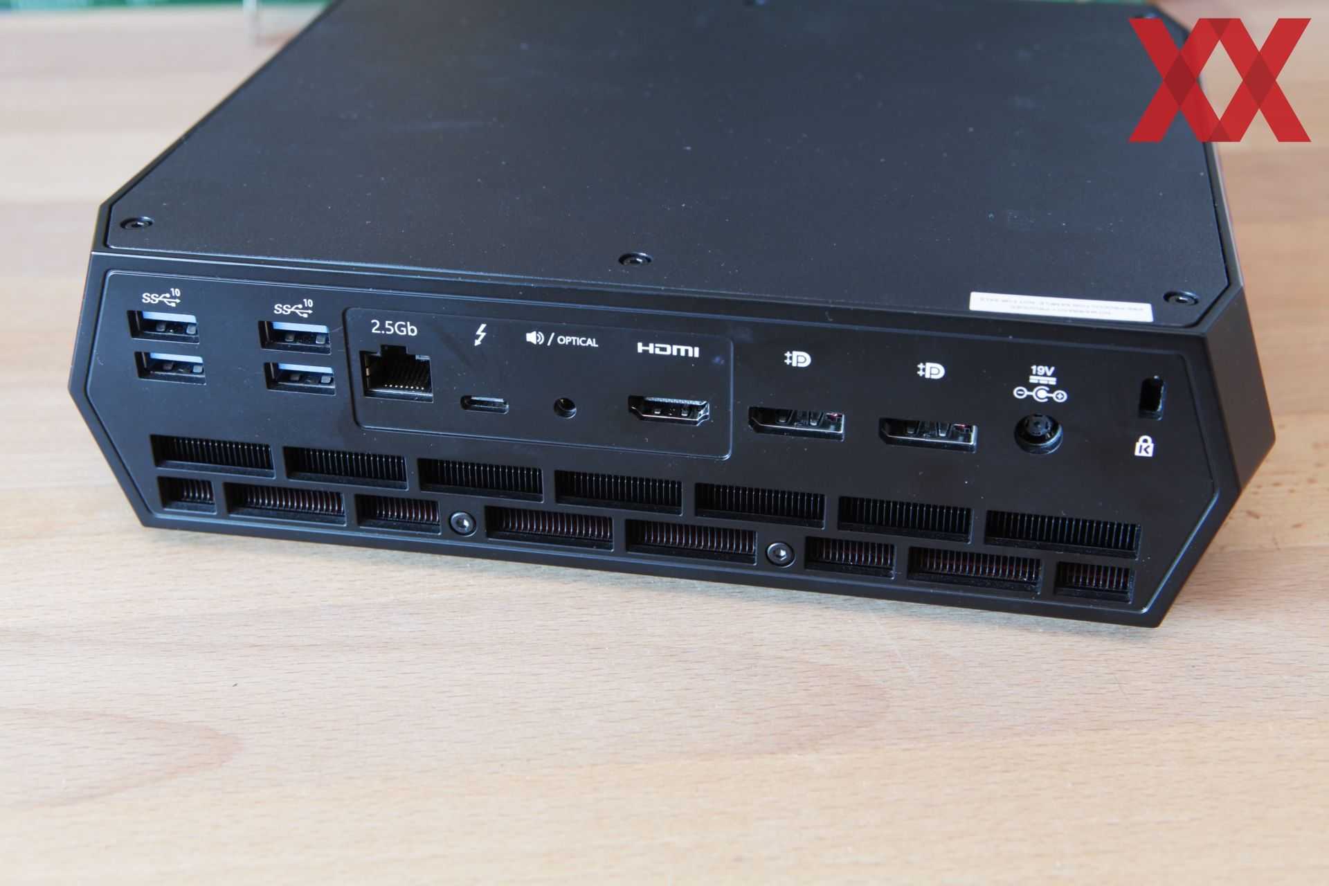 Сзади корпуса портов уже больше. Четыре USB 3.1 Type A занимают верхний левый угол. Рядом добавлен порт RJ45 с поддержкой 2.5GbE, Thunderbolt 4 Type C и оптический TOSLINK. Правее установлены HDMI 2.1 и два DisplayPorts 1.4. Наконец, отметим гнездо внешнего блока питания.