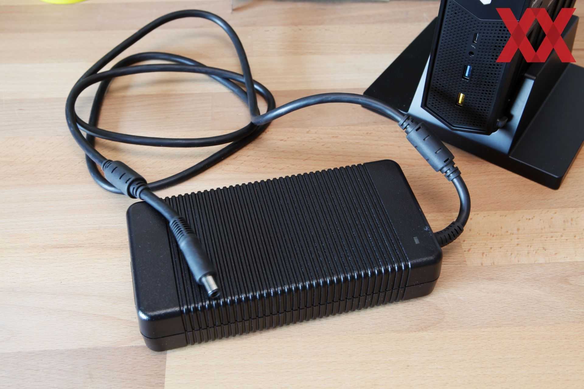 Внешний блок питания подключается через штекер IEC. Номинальная мощность БП составляет 330 Вт. С габаритами 195 x 100 x 43 мм он ненамного меньше NUC.
