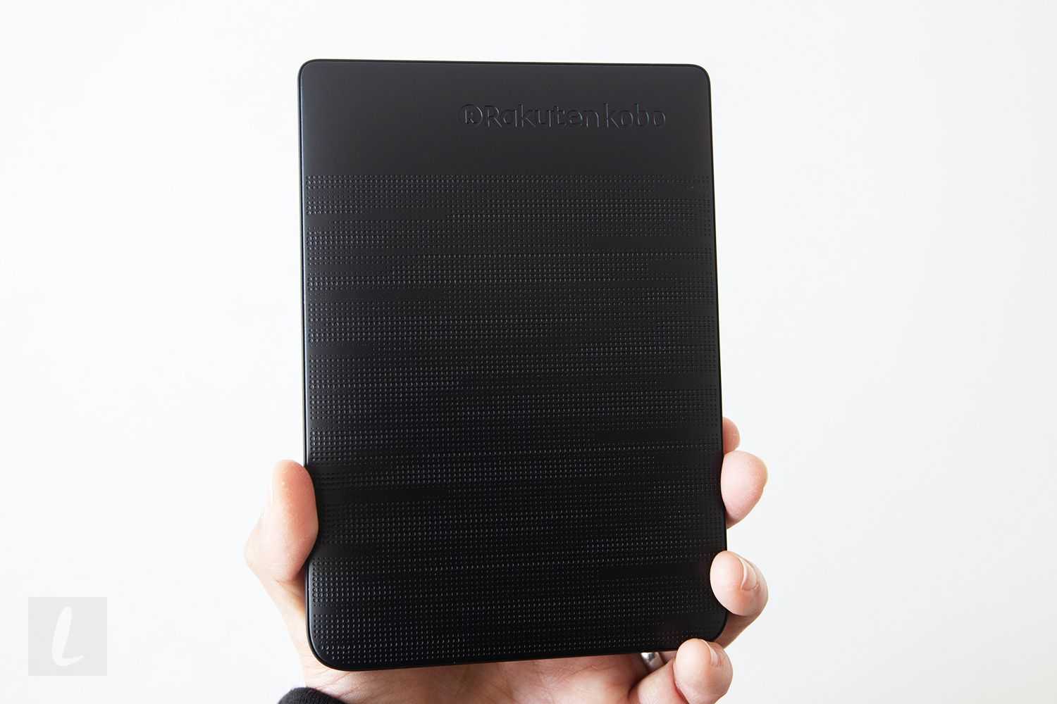 Корпус Kobo Glo выполнен из приятного на ощупь матового пластика с эффектом софттач, при этом на окантовке экрана и боковинах поверхность гладкая, а для оформления спинки используется характерная для ридеров Kobo диагональная текстура. Фронтальная панель содержит лишь обозначение бренда, ни одной аппаратной клавиши здесь нет, так как управления ридером возложено на сенсорный инфракрасный экран. Так же пуста и задняя панель – еще один логотип по центру, сформированные диагональными углублениями ромбы и всё.