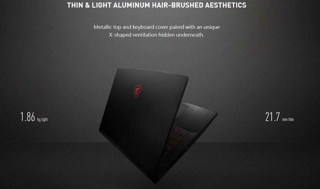 Внешний вид Несмотря на то, что ноутбук MSI GF63 относительно бюджетная модель, но на дизайне производитель не стал экономить. Крышка и верхняя панель корпуса выполнены из шлифованного алюминия с узором, что придает ноутбуку элегантности. Экран NanoEdge позволил сделать тонкие рамки и получить диагональ 15.6 дюймов в корпусе идентичному по размерам прошлым моделям с диагональю 14.0 дюймов. Стоит отметить, что ноутбук имеет тонкий профиль – 21.7 мм, а вес его 1.86 кг, что вполне легко и компактно для игрового ноутбука.