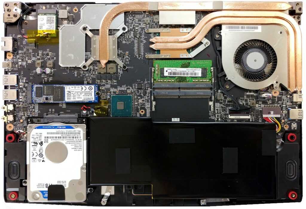 12 screws safely hold the base panel with one of them having a warranty seal. The MSI company told us that they would still accept a torn seal. But it’s only possible if a user did it to change RAM or drive. Under the panels are HDD and SSD adapters, as much as one for Wi-Fi. Also, there you’ll get access to the cooling system and a couple of memory slots.
