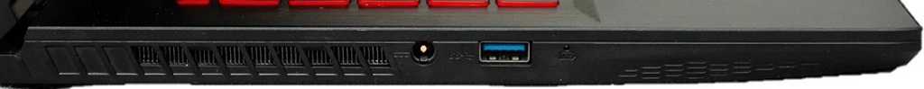The GF63 Thin’s physical connections start on the left side with a USB-A 3.2 Gen 1 port and the barrel-style connector for its 120-watt power adapter. The LED battery charging indicator is next to the USB port.