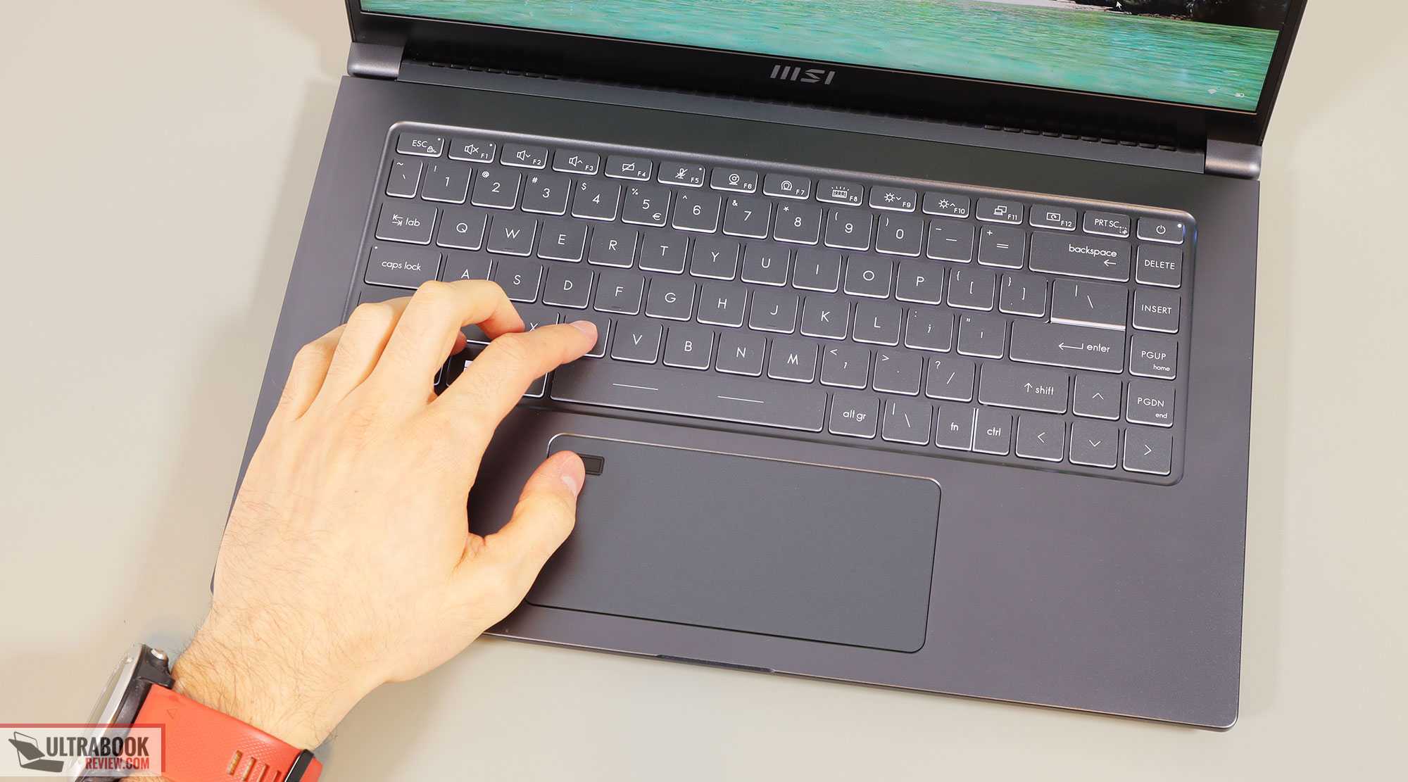 Клавиатура удобная — клавиши нажимаются мягко и уверенно, раскладка без каких-либо причуд. Набирать тексты приятно, пальцы не устают. Есть подсветка с тремя градациями яркости. Тачпад крупный, поддерживает стандартные жесты Windows. Правда, лучше отключить то, что связано с двойным касанием, иначе при прокрутке будет включаться контекстное меню и запускать режим просмотра всех рабочих столов. Ещё можно придраться к подсветке кнопки включения: она постоянно горит и мешает во время просмотра фильмов в тёмное время суток. Отключить её нельзя.