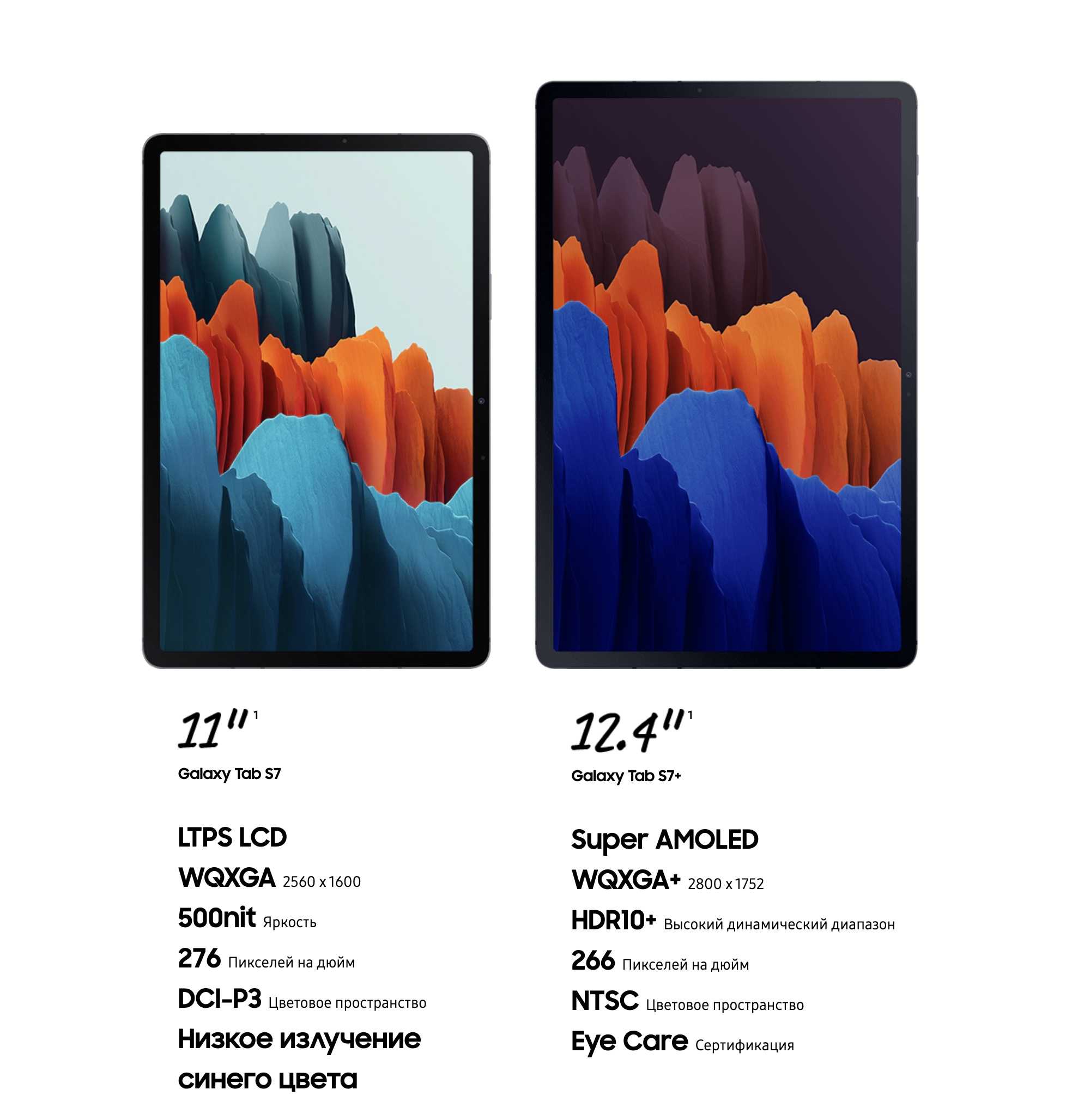 Малыш S7 имеет экран 11 дюймов, в реальной жизни этого более чем достаточно и для просмотра почты, и для документов, и для сериалов. У S7+ дисплей 12,4 дюйма, почти что какой-нибудь бизнес-ноутбук. У S7 тип дисплея LTPS TFT, у S7+ — sAMOLED, оба дисплея умеют в 120 Гц, немного отличается разрешение. Картинка хороша у обеих. У маленькой версии батарея 8000 мАч, у большой — 10 090 мАч. У большого планшета датчик отпечатков пальцев под дисплеем, у маленького в кнопке.