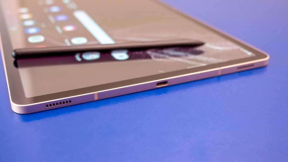 На правой стороне планшета Samsung Galaxy Tab S8 Ultra вы найдете два из четырех динамиков и разъем Type-C. На левом разместились еще два динамика и микрофон.