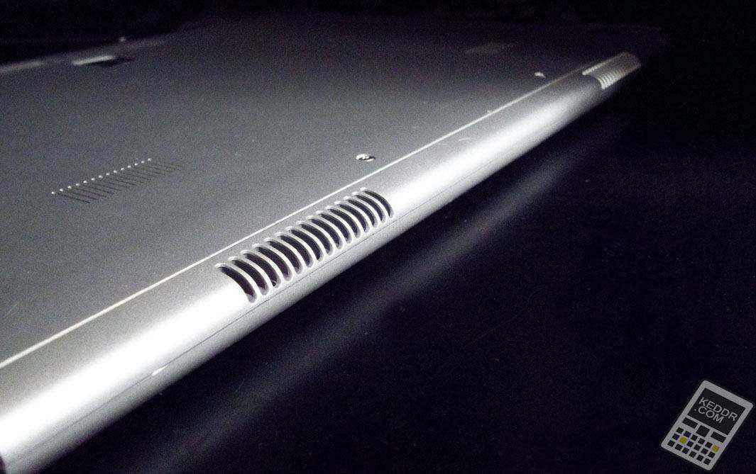 На нижней стороне находятся вентиляционные отверстия и динамики. Внутрь ноутбука залезть нельзя. О динамиках особенно сказать нечего, достаточно посмотреть на их размер. Они довольно громкие, но качество звучания не на высоте. Ну, никто особенно и не ждал звучания домашнего кинотеатра в 11-дюймовом ноутбуке. Выше мы уже говорили про заляпывание ноутбука, фотография ниже это наглядно демонстрирует.