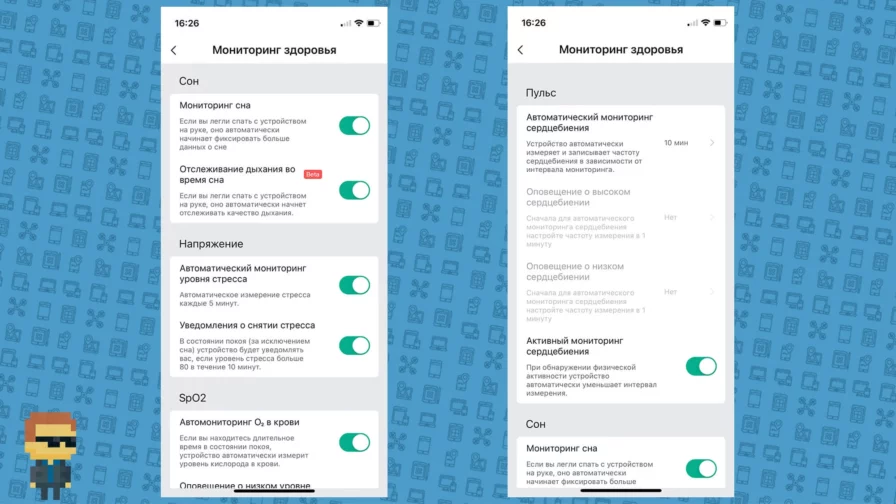 Поддерживается автоматический мониторинг SpO2, который можно включить как на часах, так и в приложении Zepp на телефоне.