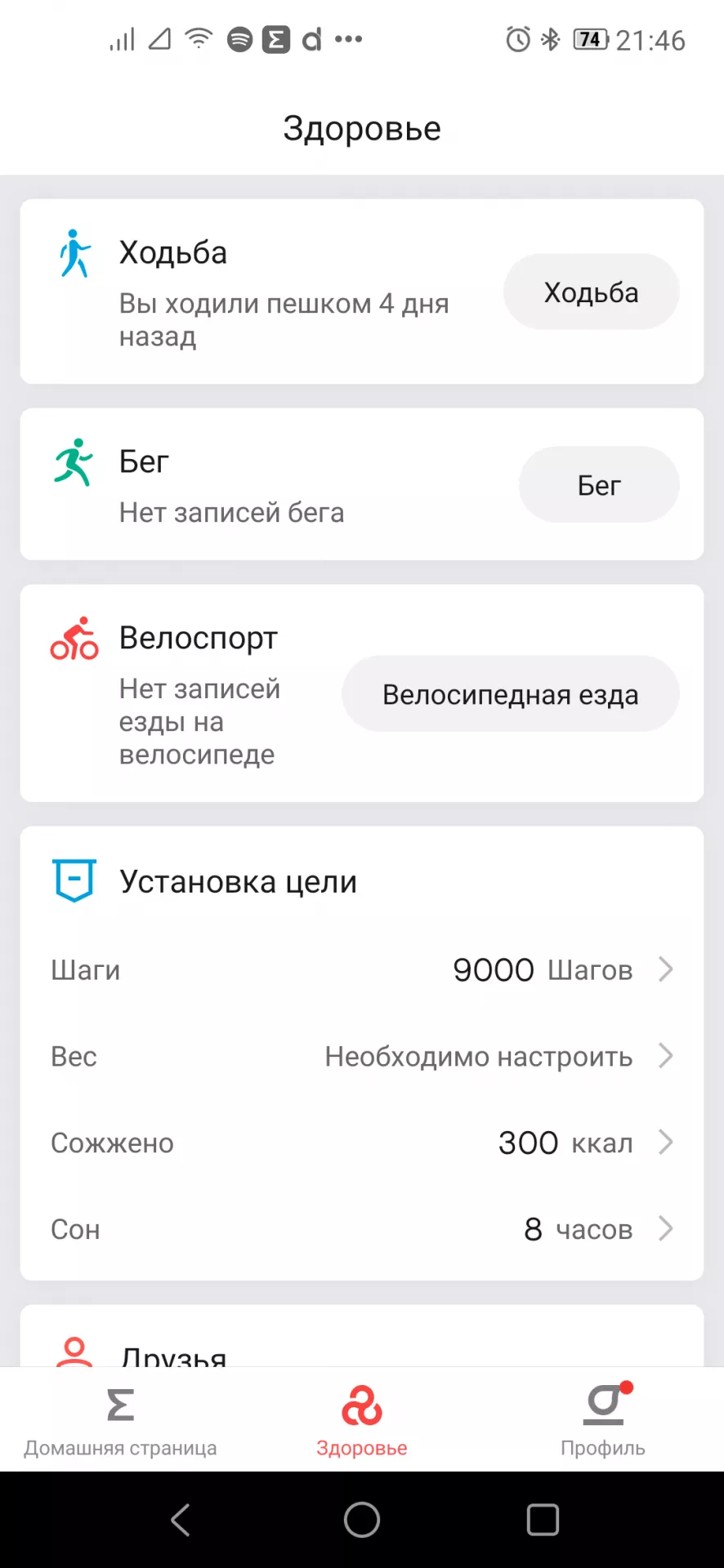 Во следующей вкладке «Здоровье» представлены в основном данные по ходьбе, бегу, езде на велосипеде с привязкой к спутниковой карте, тут можно установить цели в виде количества шагов, которые необходимо пройти, калорий, которые необходимо сжечь и часов в сутки, которые необходимо посвятить сну.