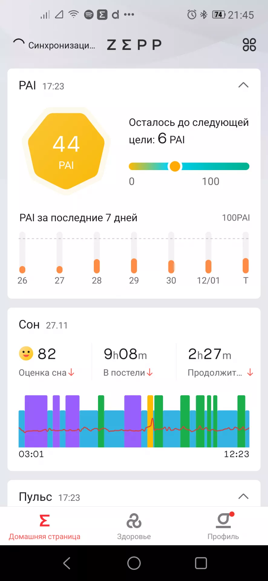 В мобильном приложении Zepp на главном экране отображаются такие параметры, как некий общий индекс оценки здоровья пользователя PAI, график фаз и качества/количества сна, суточные результаты измерения пульса, уровень стресса организма и насыщения кислородом крови, краткие данные по прошедшим тренировкам, от которых можно перейти к более подробным, счётчики пройденных шагов, сожжённых калорий, индекса физической нагрузки EPOC и так далее.