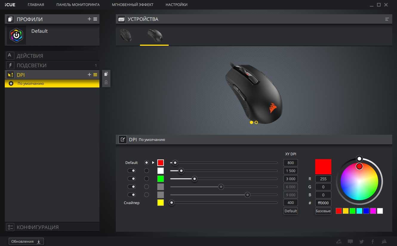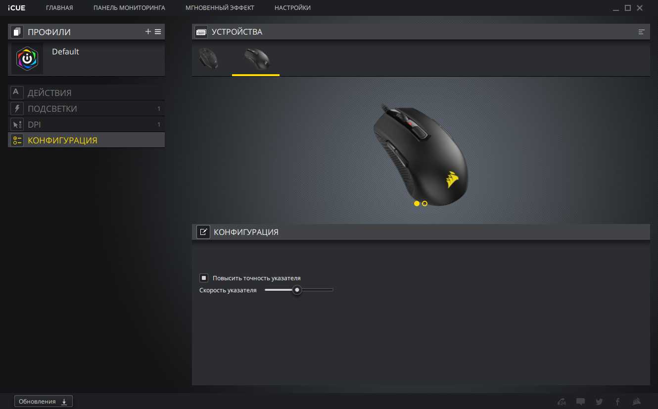 Мы уже не единожды описывали функционал официального программного обеспечения — Corsair Utility Engine. Оно доступно для скачивания на официальном сайте и абсолютно бесплатно. Настройка манипулятора происходит с помощью четырех вкладок, которые отвечают за различную функциональность мышки. Ошибиться или заблудиться в настройках невозможно. Все переведено на русский язык и интуитивно понятно.