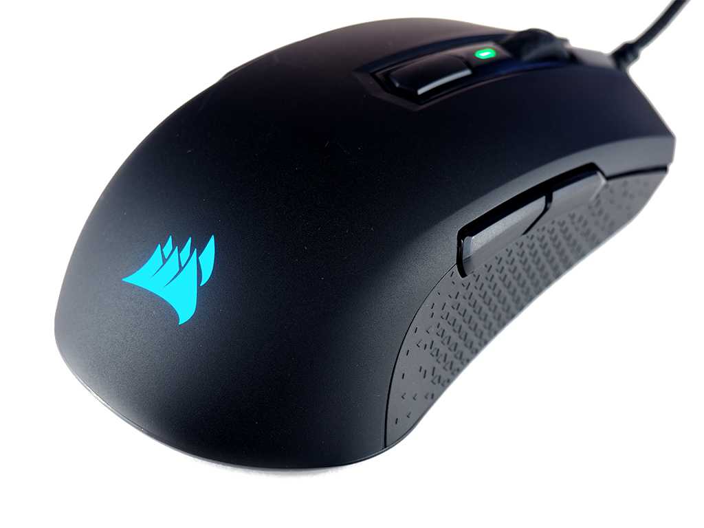 Даже внешний вид говорит нам о том, что Corsair M55 RGB Pro более взрослый продукт с классическим дизайном. Чёрный по цвету корпус украшен подсвечиваемым фирменным логотипом на задней панели и диодом, указывающим выбранное разрешение сенсора. Боковые стенки имеют нескользкую поверхность, которая предотвращает выскальзывание периферии из вашей руки, при более захватывающих игровых сессиях. Мы также можем найти подобное покрытие на колесике прокрутки.