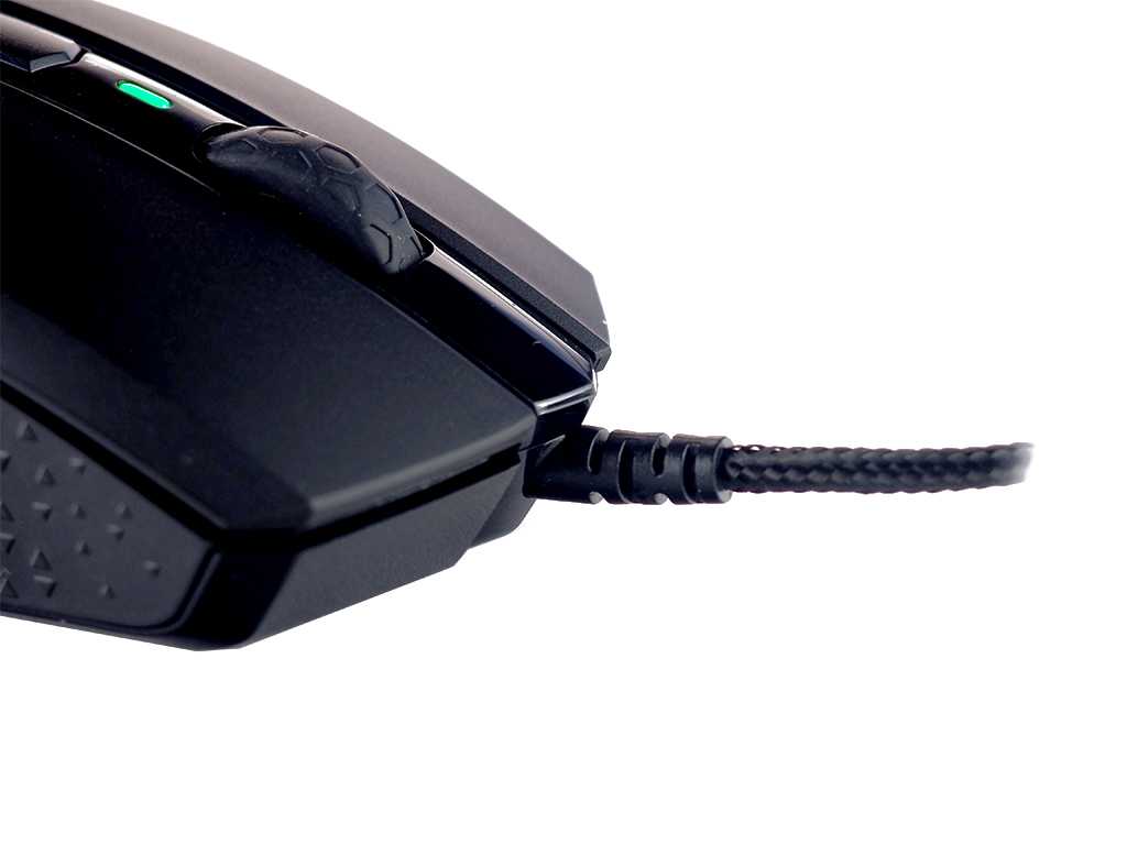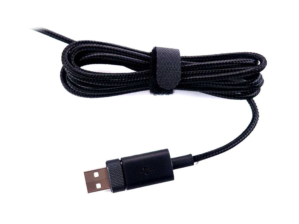 Соединяющий кабель длинной 1,8 метра имеет тканевую оплетку и обычный USB штекер, хорошо держит форму и заходит в манипулятор по центру. В месте фиксации расположена жесткая защита от надломов.