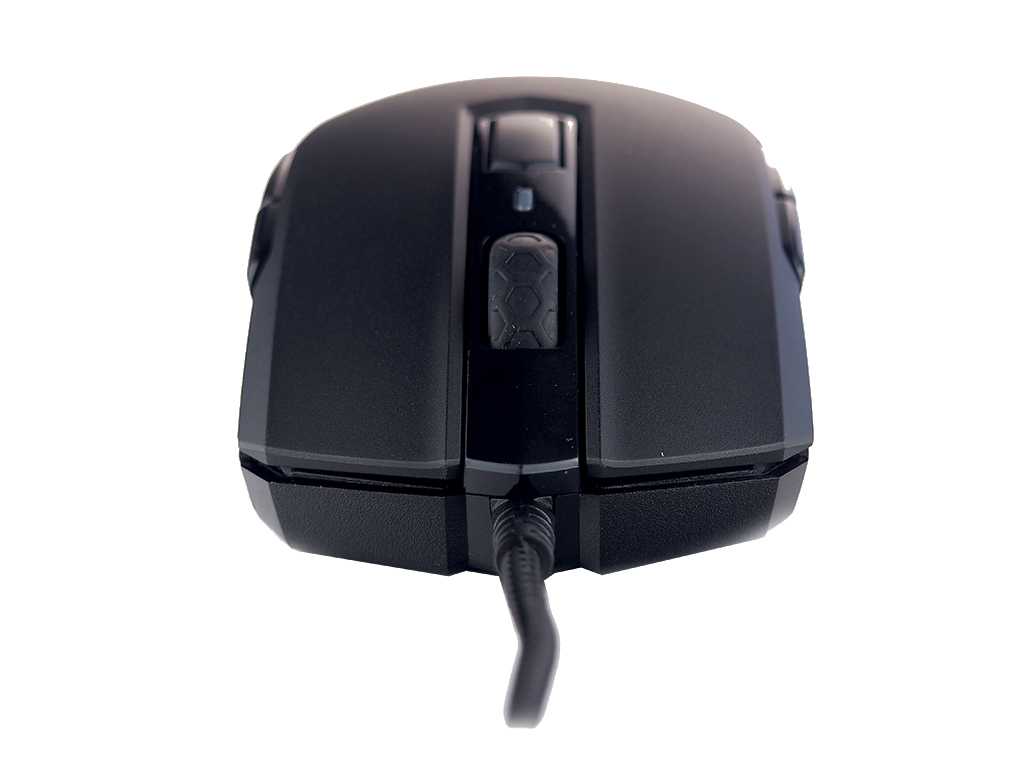 Все кнопки у Corsair M55 RGB PRO расположены симметрично. По центру размещена кнопка переключения разрешения со светодиодным индикатором и колёсико прокрутки с дискретным ходом и третьей кнопкой. Ну, а по бокам расположены по две дополнительные клавиши. Если удерживать боковые клавиши нажатыми в течении пяти секунд, то мышь переключится между режимами работы под левую или правую руку. Также переключить мышь можно и при помощи фирменного программного приложения Corsair iCUE.