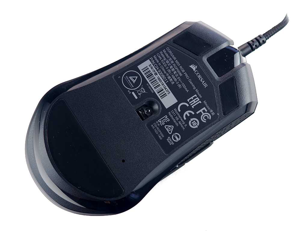 На нижней части корпуса расположены три фторопластовые накладки для скольжения манипулятора и глазок оптического датчика в центральной части. Провод у Corsair M55 RGB PRO имеет такую же тканевую оплётку, как и провод клавиатуры. Даже разъёмы USB у них одинаковые, да и длина та же — 1,8 м. Вот только толщина провода мыши существенно меньше.