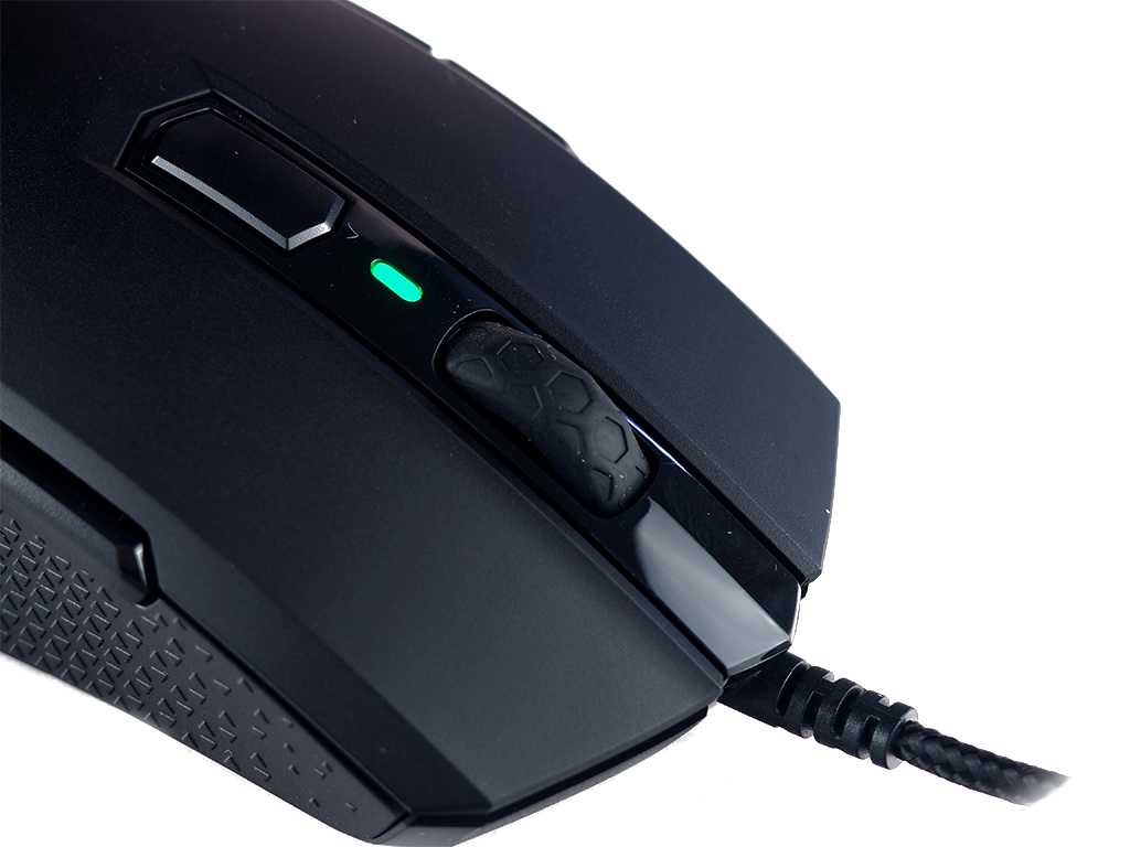 За колесом прокрутки располагается кнопка переключения чувствительности, которая имеет форму вытянутого шестиугольника. Регулировка чувствительности меняется от 200 до 12 400 DPI по пяти предустановленным профилям. Яркий светодиод сигнализирует о смене режимов чувствительности.