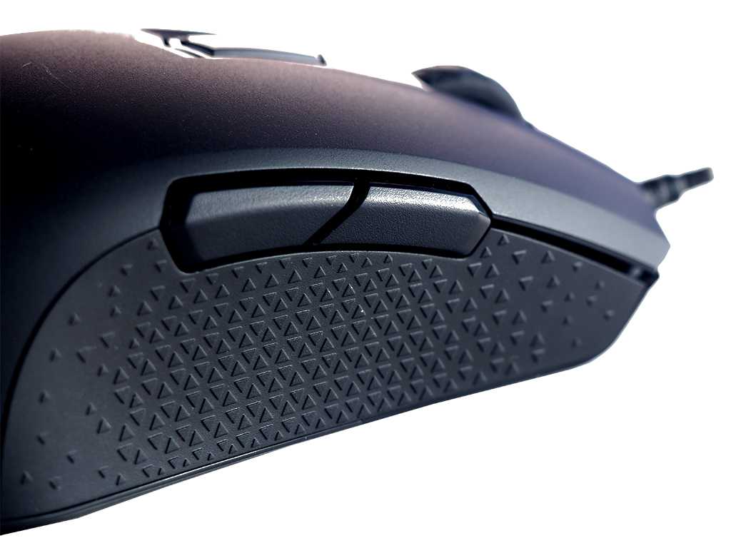 Мышь имеет две боковые изогнутые прорезиненные вкладки с мелкой текстурой из стильных треугольников, что обеспечивает хороший и удобный хват. Как уже упоминалось, на каждой из сторон находятся две боковые кнопки под большой палец. Смена ориентации между правой и левой рукой осуществляется или через фирменное программное обеспечение, или удержанием более пяти секунд боковых клавиш. Расположение этих кнопок очень удобное, так как нажатие их большим пальцем происходит без каких-либо затруднений и с ощутимым тактильным контактом.