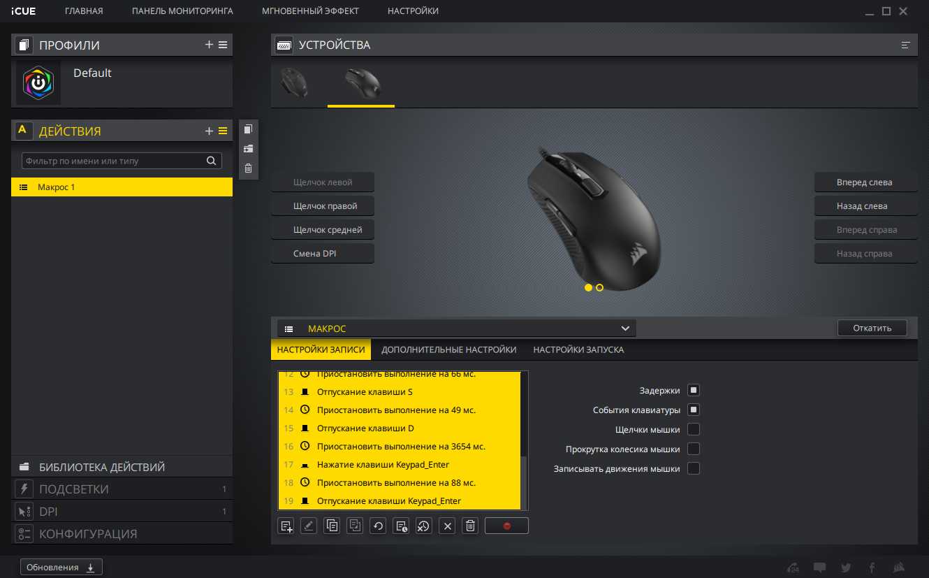 - Действия — здесь вы устанавливаете действия кнопок и макросов для каждой из кнопок, кроме главной левой кнопки; этот остается неизменным. Программирование макросов — это запись их — мы включаем запись и выключаем ее после выполнения каких-либо действий. Практически нет предела назначению клавиши. Защелкиваются ли заглушки? Нет проблем. Он отвечает за разгон музыки? Вот, пожалуйста. Или, может быть, вы хотите изменить его как ярлык для приложения? Почему нет!